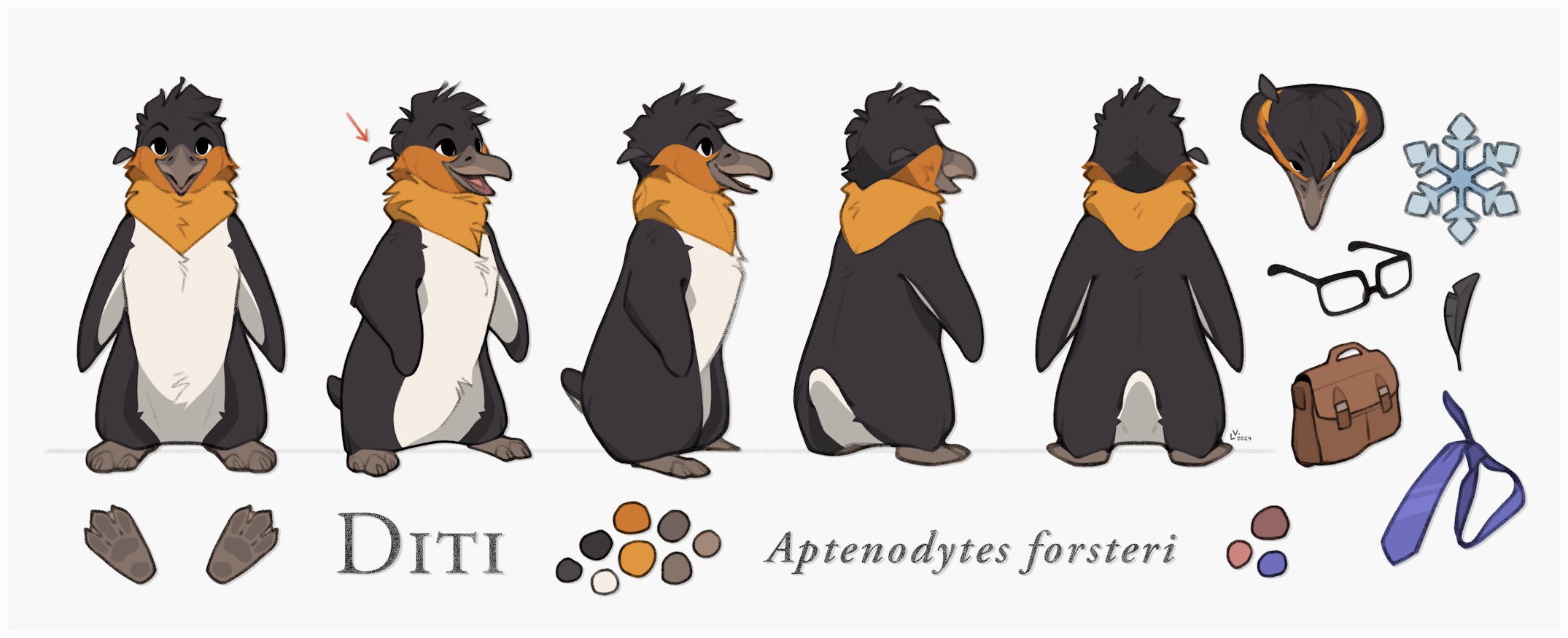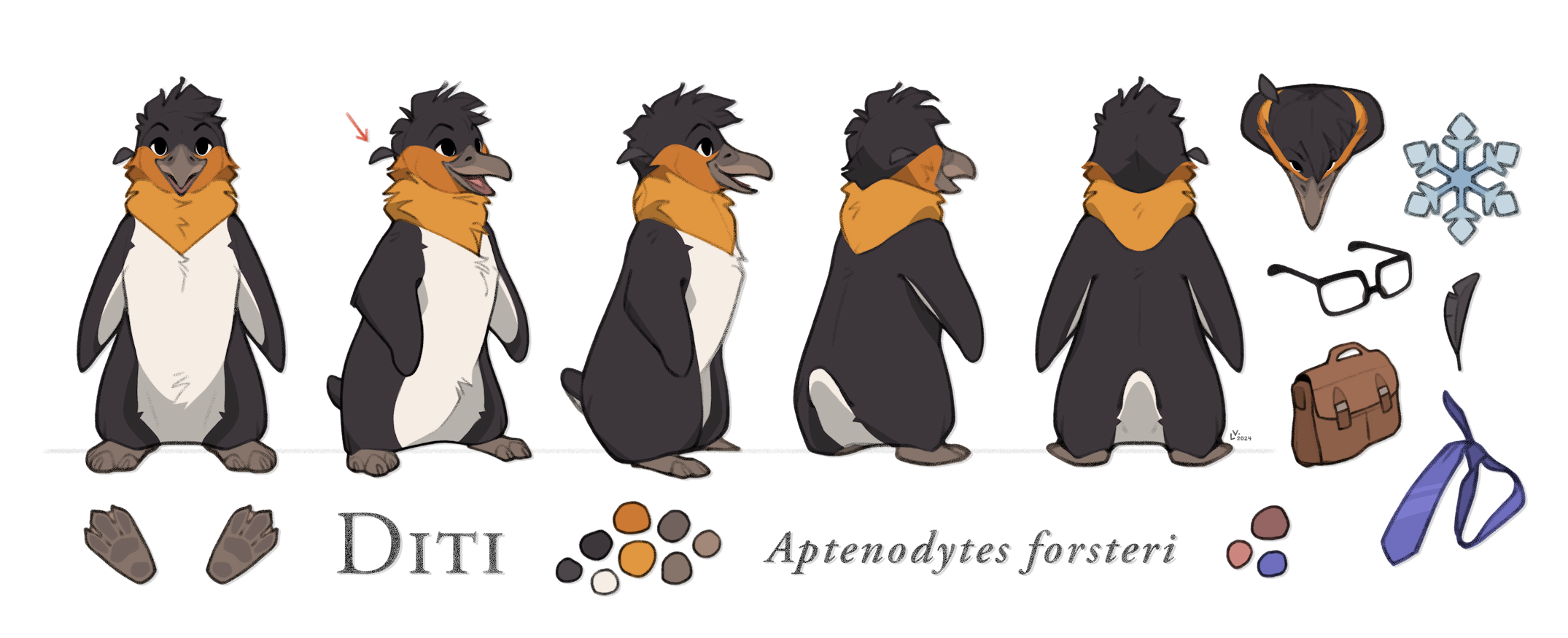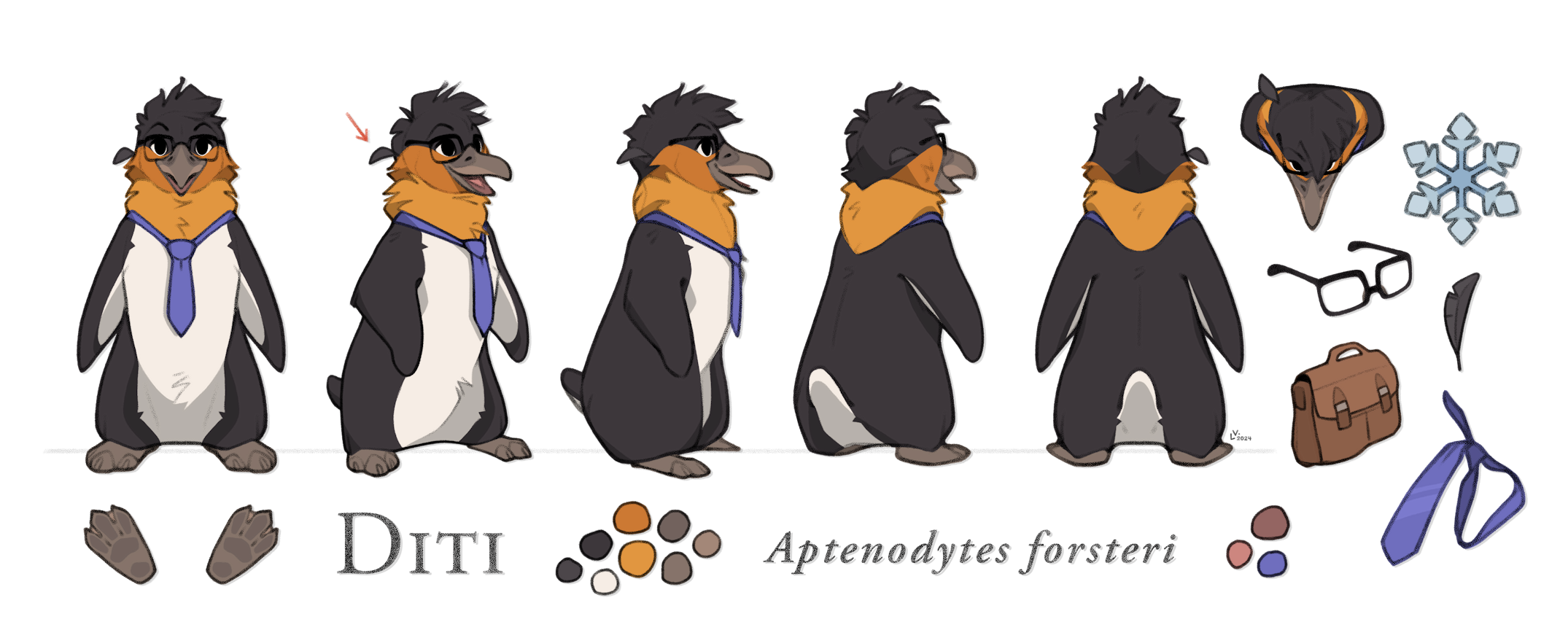 He is 1.20 meters tall. He usually wears square glasses and an indigo tie, which complement his orange feathers.